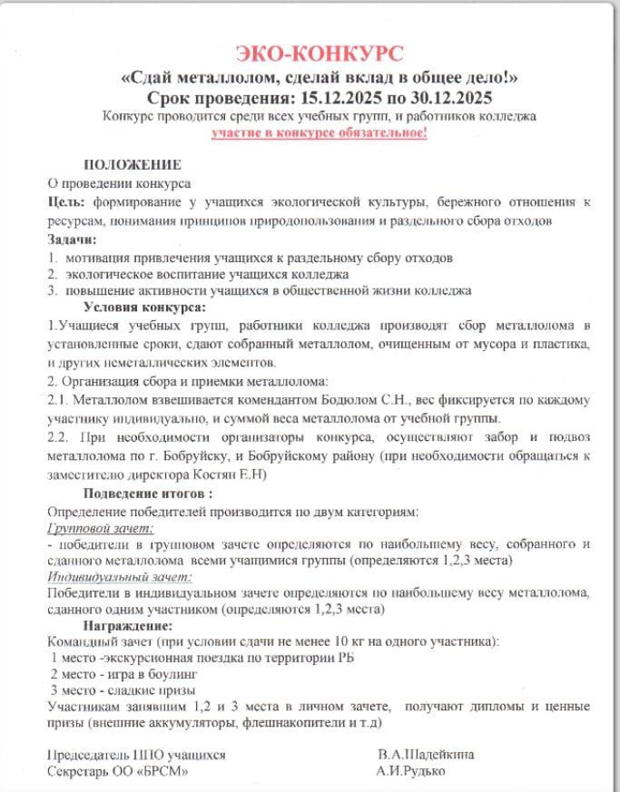 Збор металалому з 15 па 30 снежня названы «эка-конкурсам» (скрын на фота ніжэй) пад эгідай БРСМ і першаснай прафсаюзнай арганізацыі навучэнцаў. Удзел усіх груп строга абавязковы. Узважваць і збіраць металалом будзе камендант. Пры неабходнасці магчымы вываз і падвоз па Бабруйску.